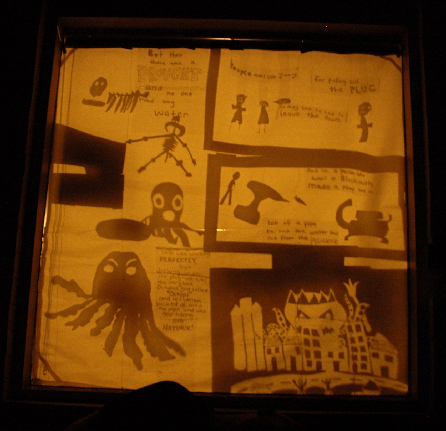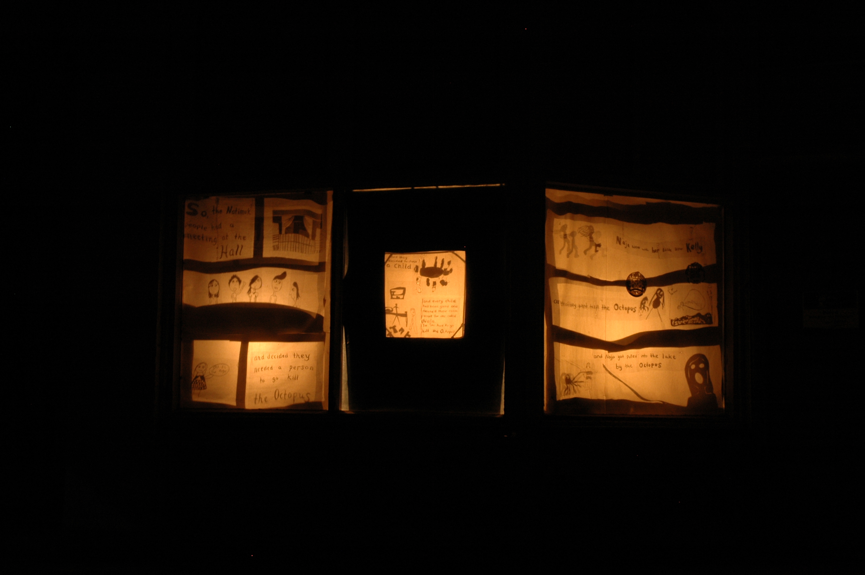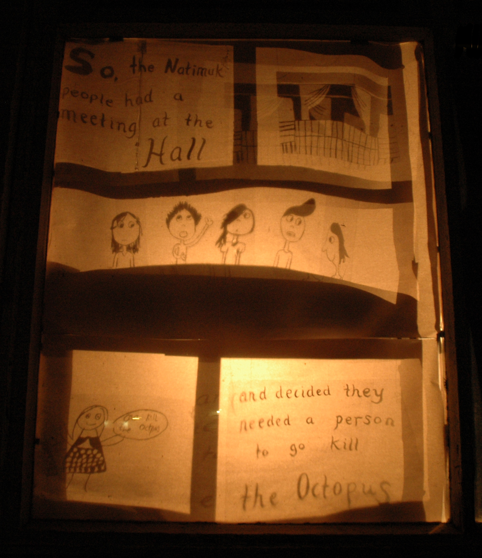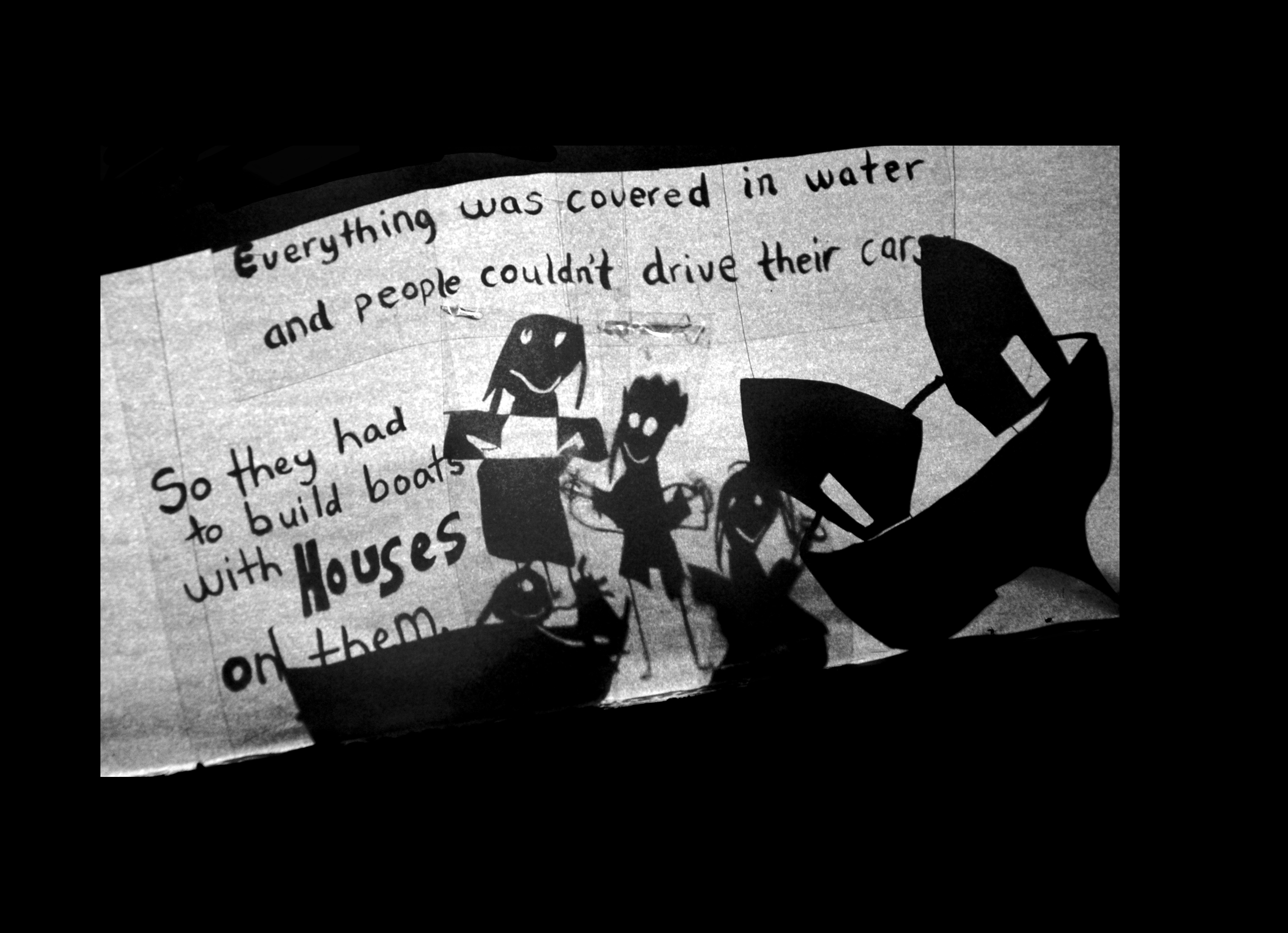Together with the children of Natimuk, Hannah worked to create and illustrate the story of a terrible flood that completely covers the town of Natimuk. The public showing of the story was realised as a shadow installation in the windows of private homes around the town.